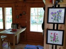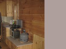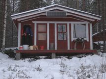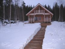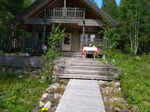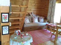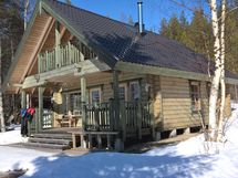 59 m²:n hirsimökissä korotettu huonekorkeus tuo tiloihin avaruutta ja valoisuutta. Aurinkopaneeli tuottaa sähkön valaistukseen ja televisioon.