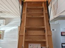Olohuoneesta ala laskettavat portaa parven tiloihin.