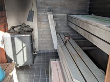 Lattia: Keittiössä: lauta. Pesutiloissa: laatta. Olohuoneessa: lauta. Saunassa: laatta. Seinät: Keittiössä: puu. Pesutiloissa: puu. Makuuhuoneessa: puu. Saunassa: puu.