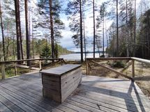 - Asunnossa on terassi. Mökin edessä on terassi johon mahtuu pöytäryhmä ja toisen saunan edessä on suuri terassi. Terassilta avautuu näkymä järvelle.
