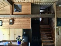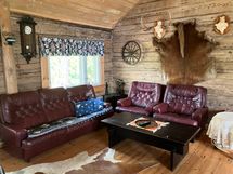 Hirsinen saunamökki 47 m2, jossa sauna, iso takka/makuuhuone.