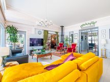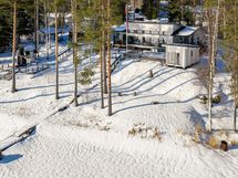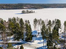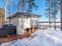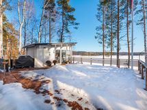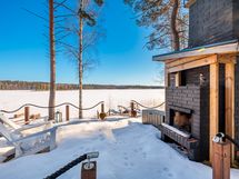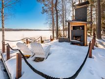The generous 2,400 m² private plot slopes down to Lake Saimaa and includes a sandy beach, swimming dock and boat pier, as well as a lakeside terrace with an outdoor fireplace. In addition to the main house, the property includes a 15 m² log outbuilding that can be used as a guest house or a relaxing retreat after the sauna.