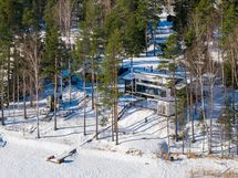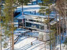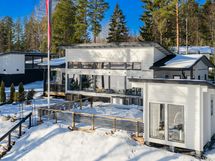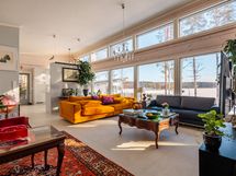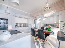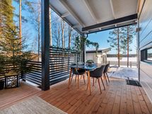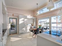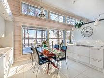 The interior layout is bright and spacious, with large windows facing several directions and beautiful views toward Lake Saimaa. The open kitchen is designed for both everyday living and entertaining, offering generous workspace, stone countertops and integrated appliances. The kitchen is equipped with an induction cooktop, dishwasher, refrigerator and freezer, along with ample cabinet and storage space.