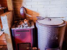Sauna. On. Harvia lämmittää ilman ja Kota vedet. Sähköpumppu pumppaa vettä pataan kaivosta ja sillä kelpaa nyt ainakin peseytyä.