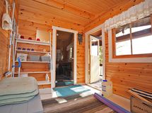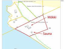 Lisätietoja: saunan jätevedet imeytetään maastoon (kivipesä), mökin jätevedet menevät harmaavesisuodattimeen, josta ne johdatetaan maastoon.