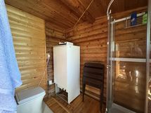 Pesutilojen varusteet: polttava wc, lämminvesivaraaja, suihkukaappi ja suihku. Erillisen WC:n kuvaus: pesutilojen yhteydessä polttava wc, lisäksi erillinen puucee.