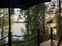 Jylhällä rinnetontilla sijaitseva kaunis perinteinen mökki ja rannan hirsirakenteinen sauna saunakamareineen odottavat uusia kesäasukkaita.