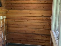 Hirsimökki meren rannalla, sähkö- ja vesiliittymät