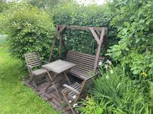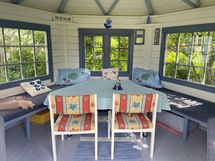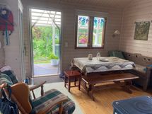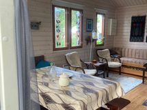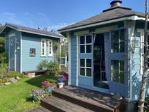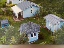 25 neliön mökki, jossa lisäksi 2 m leveä kuisti, 9 neliön huvimaja, 7 neliön rakennus, jossa varasto ja ekovessa, sekä reilun 3 neliön kokoinen pesukatos