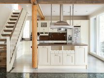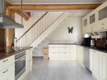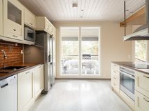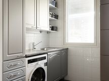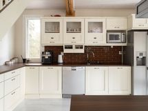 Lattiat: laminaatti, Seinät: sisustuslevy / maalattu, saareke. Työtasot laminaatti.