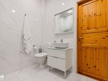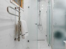 Pesuhuoneen seinärakenteisiin on lisätty paksut modernit eristeet, Seinät ja lattia on laatoitettu korkealaatuisilla Villeroy Boch ‐marmoriefektisillä laatoilla, Kaikki