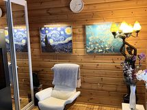 kalusteet – suihku, wc, allaskaapisto ja säilytys – ovat Svedbergsin,sähkökäyttöinen kuivausnaulakko, . Kattoon integroitu tuikkuvalokuituvalaistus luo tunnelmallisen “tähtitaivas”‐efektin.