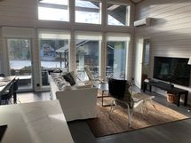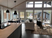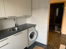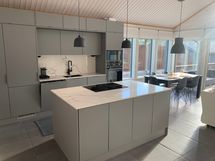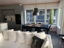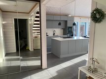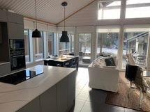 Keittiön varusteet: Jääkaappipakastin, uuni, liesi, astianpesukone, keittiösaareke ja liesituuletin. Liesi: Keraaminen liesi. Työtason materiaali: Kivi.