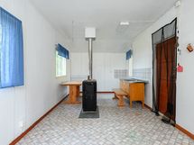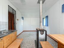 Mökissä on tupa, keittiönurkkaus. Keskellä huonetta on kamina.
