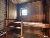 Kuvaus: Erillinen piharakennus jossa sauna ja pesutilat. puukiuas