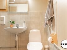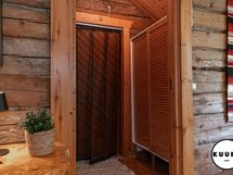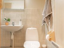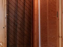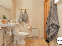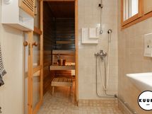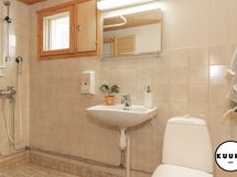 - Pesutilojen varusteet: WC-istuin, suihku, pesuallas ja peili. Pesutilojen kuvaus: Vaalean sävyisistä saunan yhteydessä sijaitsevista pesutiloissa löytyy suihkun lisäksi wc-istuin ja allas hanalla.