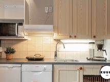 - Keittiön varusteet: Jääkaappi, liesi, liesituuletin, mikroaaltouuni ja astianpesukone. Liesi: Keraaminen liesi. Työtason materiaali: Laminaatti. Perinteinen kompakti kesämökkikeittiö, jossa onnistuvat niin erinomaisesti ruoanlaitto kuin säilytyskin.