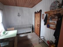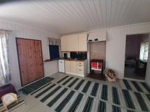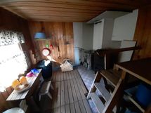 Keittiön varusteet: Jääkaappi ja puuliesi. Keittiönurkkauksen kaapiston uusiminen parhaillaan menossa.