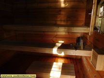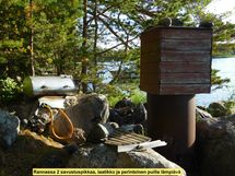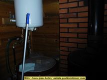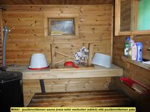 -Mökissä myös sauna ja pukuhuone jossa sänky, sekä sähköisesti lämpiävä kuumavesiboileri että puulämmitteinen vesipata.