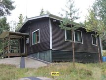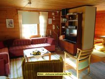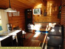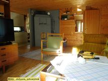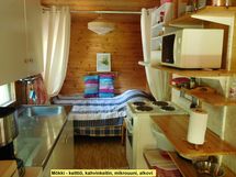 Mökissä avokeittiö/olohuone, jossa sohvat ja sänky, TV, alkovi parisängyllä, sähköliesi uunilla, mikrouuni, kahvinkeitin, juokseva lämmin/kylmä vesi.