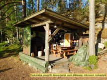 -Lisäksi rannalta löytyy grillikatos josssa kaasujääkaappi, kaasu-liesi/uuni, mikrouuni, puugrilli, pöytä ja penkit, kaikki katon alla.