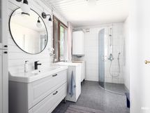 LVV (sähkö) 180 L. Varustus: suihkuseinä, pesukoneliitäntä, lattialämmitys, suihku, peili, kiinteät valaisimet, kylpyhuonekaapisto. Erillisen WC:n kuvaus: Uusittu v. 2012 sekä kaapisto päivitetty v. 2023.