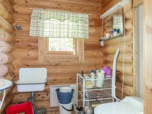 Pesutilojen kuvaus: Kph:ssa ei pesumahdollisuuksia - nämä löytyvät talon vieressä sijaitsevasta saunarakennuksesta. Varustus: kuivauskaappi, wc-istuin, peili, kiinteät valaisimet.