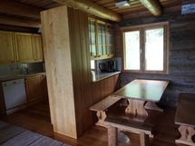 - Tilaa isolle ruokapöydälle, Paljon työskentelytilaa, Suuri tiskipöytä, Laminaattitasot, Astianpesukone, Sähköliesi, Jää-pakastinkaappi