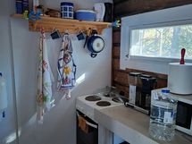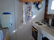 Keittiön varusteet: Liesi ja jääkaappipakastin. Liesi: Sähköhella. Työtason materiaali: Laminaatti.