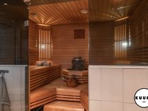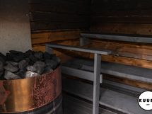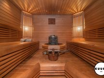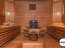 - Kiuas: Sähkökiuas. Saunassa on moderni kiuas, jonka ympärille sijoitetut lauteet molemmin puolin luovat avaran ja sosiaalisen tunnelman. Ratkaisu tekee saunasta erinomaisesti myös isommille saunaporukoille soveltuvan.