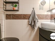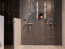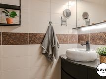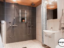 - Pesutilojen varusteet: WC-istuin, suihku, peilikaappi, pesuallas, bidee-suihku, lattialämmitys ja allaskaappi. Pesutilojen kuvaus: Tilava ja moderni pesuhuone, jossa on kaksi tyylikästä sadesuihkua. Pesutiloista löytyy myös wc ja käsienpesuallas. Lasiseinä erottaa pesutilat saunasta, mikä tuo kokonaisuuteen avaruutta ja lisää viihtyisyyttä. Erillisen WC:n varusteet: WC-istuin, lattialämmitys, allaskaappi, peili ja pesuallas. Erillisen WC:n kuvaus: Tyylikkäästi sisustettu erillinen wc, josta löytyy käytännöllistä säilytystilaa sekä peilikaappi. Huoliteltu ilme tekee tilasta sekä toimivan että viihtyisän arjen käyttöön.