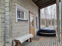 Erillinen saunarakennus on todellinen helmi – puulämmitteinen sauna ja terassilla sijaitseva palju tarjoavat täydelliset puitteet rentoutumiseen. Iso katettu terassi yhdistää mökin ja saunan, ja tarjoaa oivan paikan nauttia kesäpäivistä.