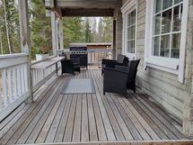 Kiuas: Puukiuas. Puilla lämmitettävä palju saunan terassilla.