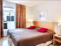 Leveä parisänky, 2 vaatekomeroa, yöpöydät, työpöytä.