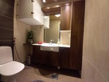 - Kylpyhuone, suihku, sähkösauna, toisen kerroksen kylpyhuoneessa poreallas, wc, allastaso, lasitiiliseinää ja TV