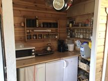 - Varusteet: jääkaappi. Työtaso: puutaso. Liesi: induktioliesi, mikroaaltouuni. Ruokailutila keittiösyvennyksineen