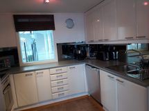 Keittiössä jääkaappi, pakastin,liesi ja uuni, mikro, astianpesukone, leivänpaahdin, astiastot ja ruoanlaittovälineet ainakin 6 hengelle ym.