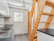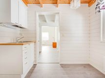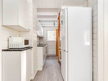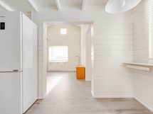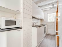 Jääkaappipakastin, liesituuletin ja liesi. Toisen puolen jenkkikaappi ei kuulu kauppaan. Lattia: Laminaatti. Seinät: Paneeli