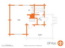 - Rakennuspiirustuksen perusteella arvioitu asuinpinta-ala on noin 34 m². Asuinpinta-alaan laskettu ensimmäisen kerroksen tilat.