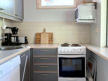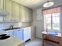 Jääkaappipakastin, sähköliesi, liesituuletin, astianpesukone, kaapistot.