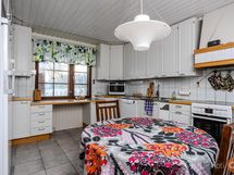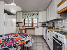 Viileäkaappi, pakastekaappi, keraaminen liesi, liesituuletin, leivinuuni alakerrassa, astianpesukone, kaapistot, kiinteät valaisimet.