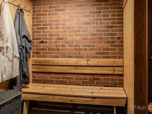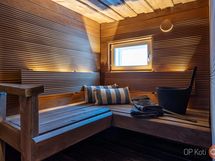 Sauna, sähkökiuas, kylpyhuone, erillinen wc, suihku, peilikaappi, allaskaappi, pesukoneliitäntä, lattialämmitys pesutilat, keittiö, khh, kiinteät valaisimet.