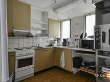 Jääkaappi, lattialiesi, sähköliesi, liesituuletin, kaapistot, kiinteät valaisimet.