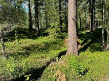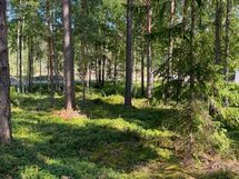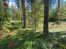 Metsäinen tasainen tontti, jossa meri siintää puiden lomassa.