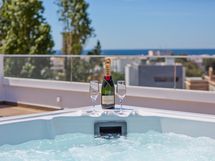 Penthouse with jacuzzi, barbecue, shower & seating area on the private roof terrace is surrounded by 3 balconies less than 5 minute walk from picture perfect fishing village & stunning beaches.