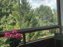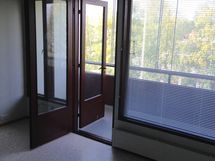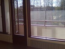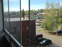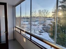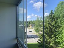 Iso ja leveä lasitettu parveke, laajat näkymät ja sälekaihtimet valmiina paikallaan.
