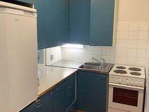 Keittokomerossa L-malliset keittiökaapistot, kunnon tiskipöytä, 4-levyinen hella, uuni ja jääkaappi pakastinlokerolla. Runsaasti tilaa tavaroille.