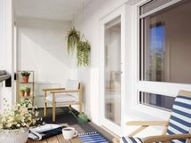 Tämän toimivapohjaisen kodin neliöt jatkuvat huoneiston levyiselle lasitetulle länsiparvekkeelle.