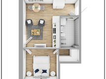 Valoisa kaksio vaatehuoneella ja modernilla avokeittiöllä