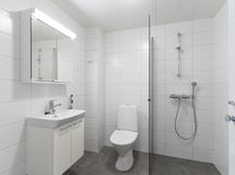 Modernissa kylpyhuoneessa on suihkuseinä, allaslaatikosto, pyykkikaappi, peilikaappi sekä tilavaraus pyykinpesukoneelle.